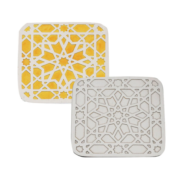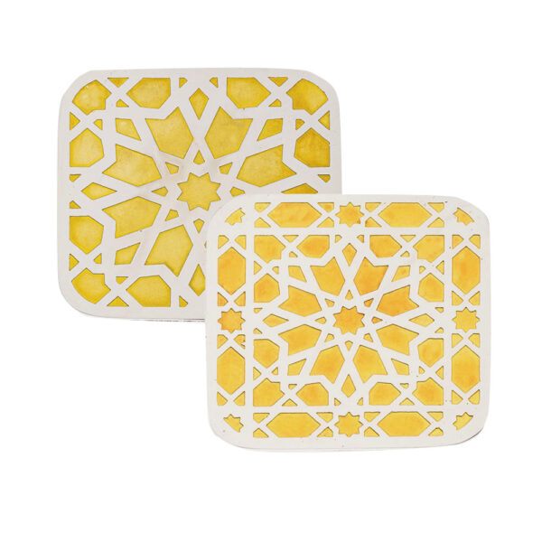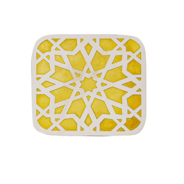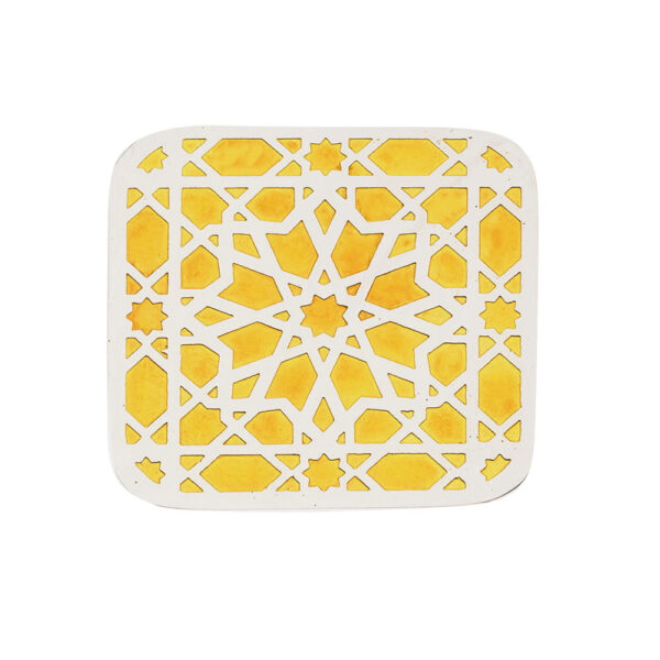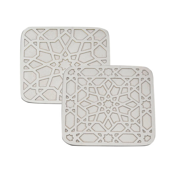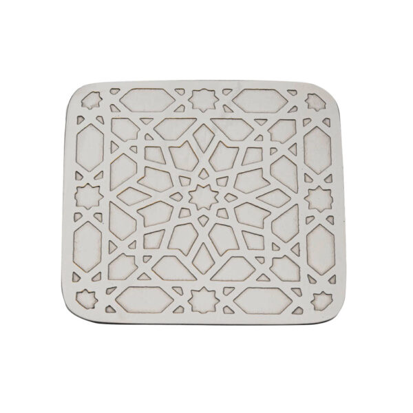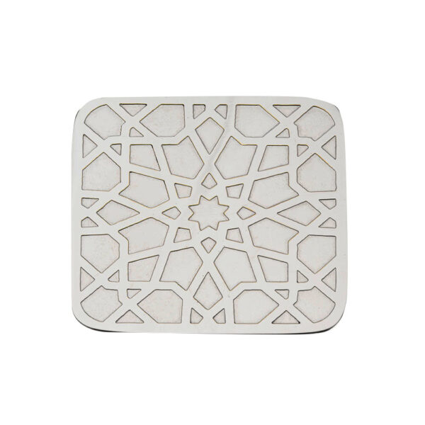 قاعدة كوب بنقشة هندسية  مصنوع من نحاس محفور مطلي بالنيكل. صُمم التصميم حصريًا لدار الآثار الإسلامية في الهند ، وقد استوحى التصميم من نمط نجمة هندسية لا متناهية التكرار يتكون من مخطط مربع للتكرار ونجوم ثمانية الرؤوس ومضلعات أخرى. التصميم مستوحى من القطعة: LNS 193 W وهي جزء واحد من لوح الباب الخشبي الذي تم تنفيذ شرائط زخرفية عليه متبعة الخطوط الهيكلية لنمط نجمة هندسية لا متناهية التكرار؛ جميع المقصورات منحوتة بتصميمات مراوح نخيلية وأنصاف مراوح نخيلية نفذت عليها الشرائط الزخرفية، والتجاويف، ولسان التعشيق، والحفر، ومثبتة بتركيبات حديدية، تعود إلى القرن الثامن الهجري / الرابع عشر الميلادي في إسبانيا.