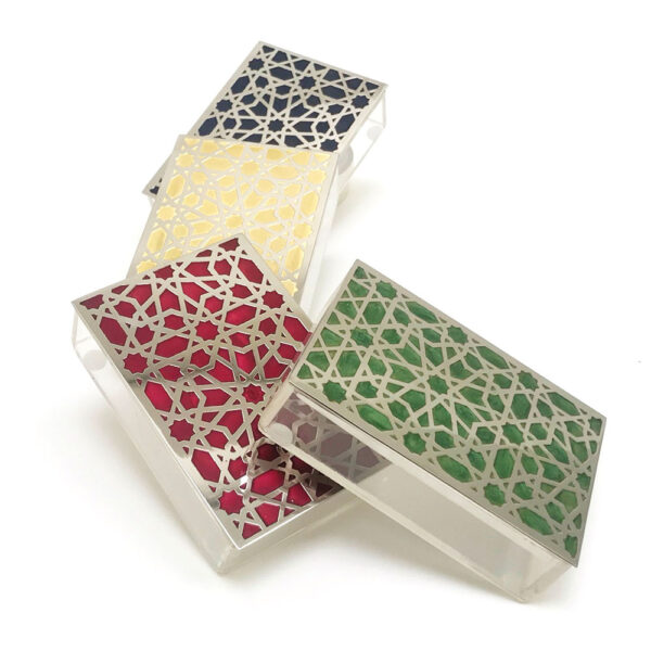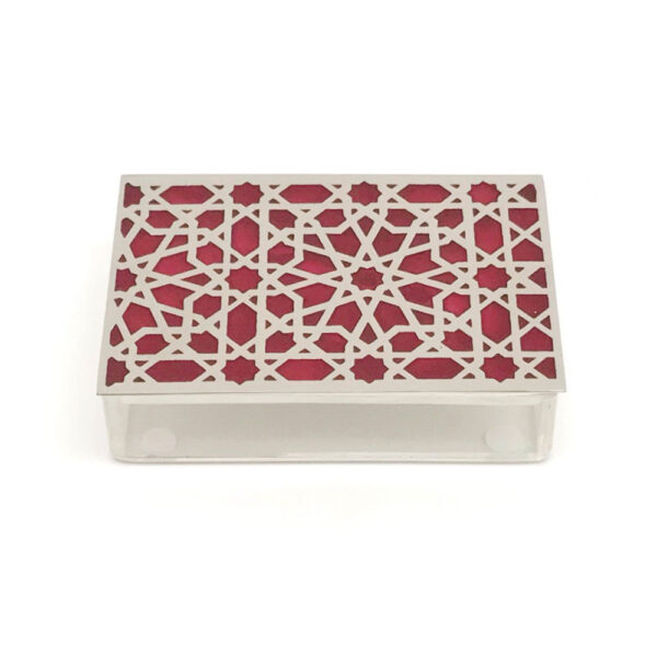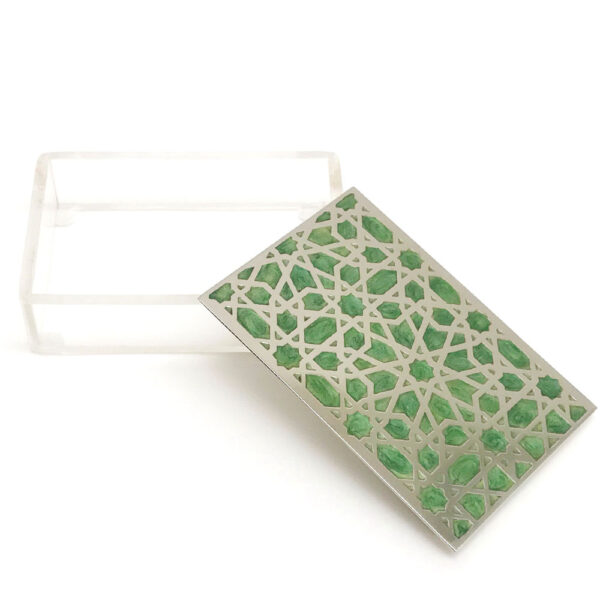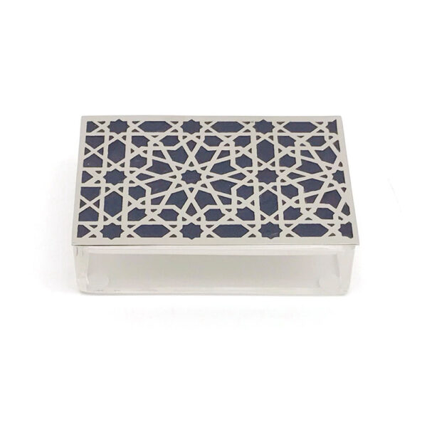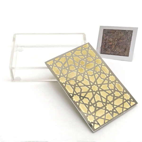 صندوقنا الهندسي الحصري مصنوع من قاعدة أكريليك مع سطح نحاسي محفور مطلي بالنيكل. صُمم التصميم حصريًا لدار الآثار الإسلامية في الهند ، وقد استوحى التصميم من نمط نجمة هندسية لا متناهية التكرار يتكون من مخطط مربع للتكرار ونجوم ثمانية الرؤوس ومضلعات أخرى. التصميم مستوحى من القطعة: LNS 193 W وهي جزء واحد من لوح الباب الخشبي الذي تم تنفيذ شرائط زخرفية عليه متبعة الخطوط الهيكلية لنمط نجمة هندسية لا متناهية التكرار؛ جميع المقصورات منحوتة بتصميمات مراوح نخيلية وأنصاف مراوح نخيلية نفذت عليها الشرائط الزخرفية، والتجاويف، ولسان التعشيق، والحفر، ومثبتة بتركيبات حديدية، تعود إلى القرن الثامن الهجري / الرابع عشر الميلادي في إسبانيا.