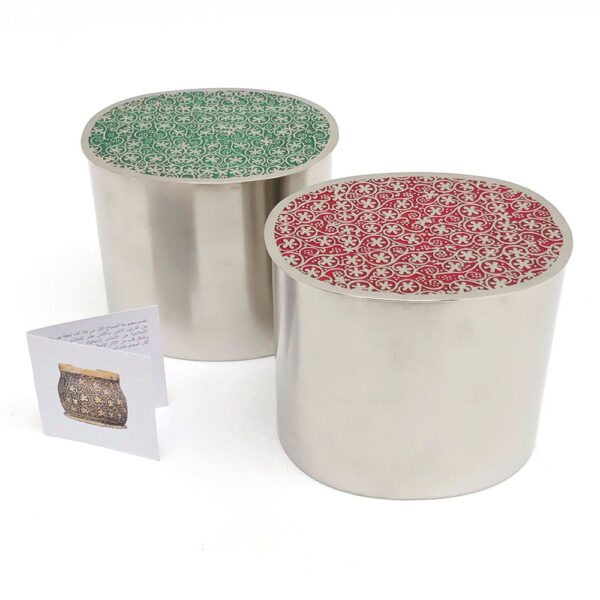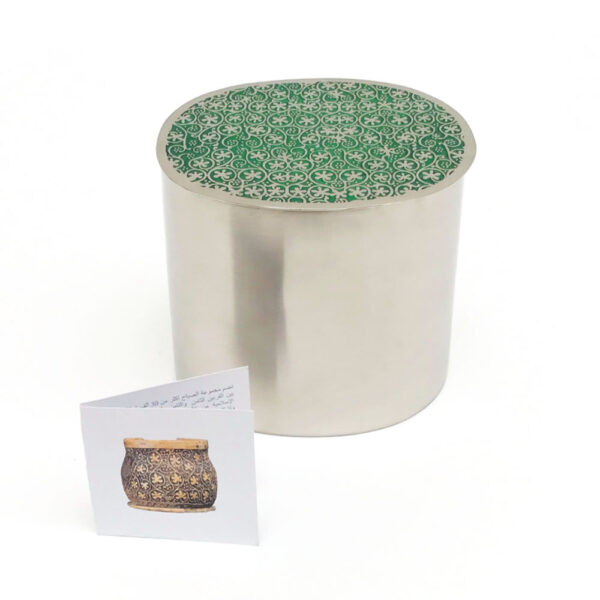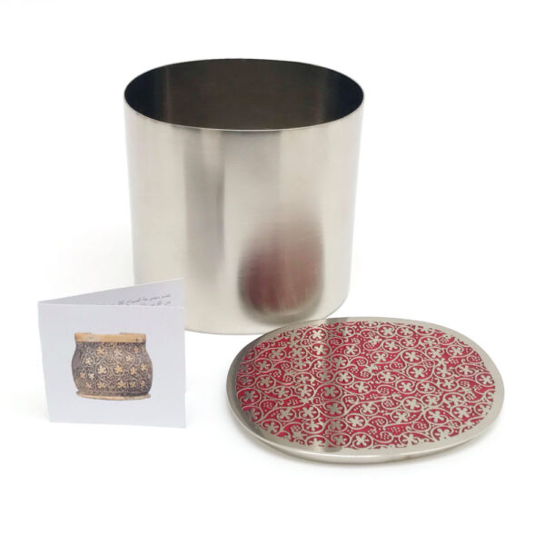 تم تصميم الصندوق برسمة كرمة العنب حصريا (ويدويا) في الهند من النحاس المطلي بالنيكل، والذي تم حفره وطلاؤه بالمينا. التصميم مستوحى من القطعة: LNS 18 I وهي صندوق عاجي (مفقود الغطاء)، ومنقوش عليه كروم متعرجة تنطلق من خمس مزهريات موزعة على مسافات متساوية حول قاعدة القطعة. القرن الثامن في سوريا، تم تنفيذه باستخدام مخرطة، ونحت من قطعة واحدة من ناب الفيل.