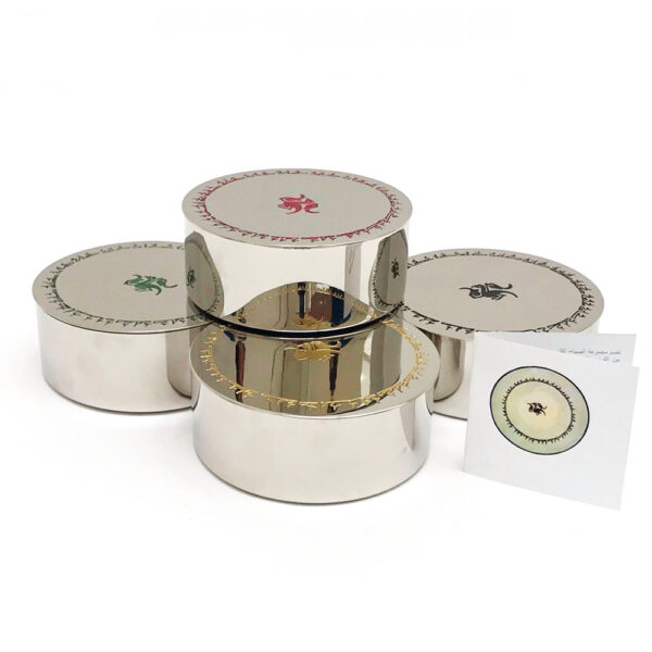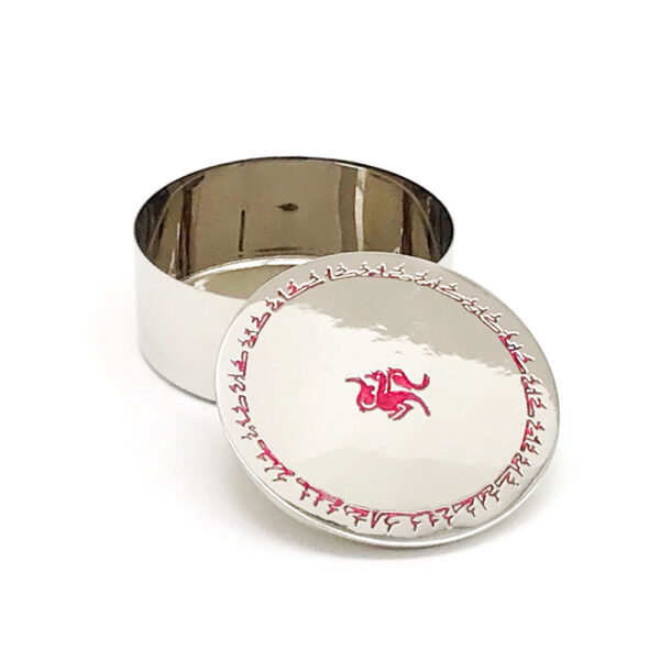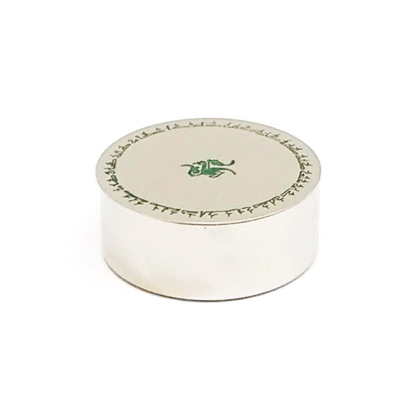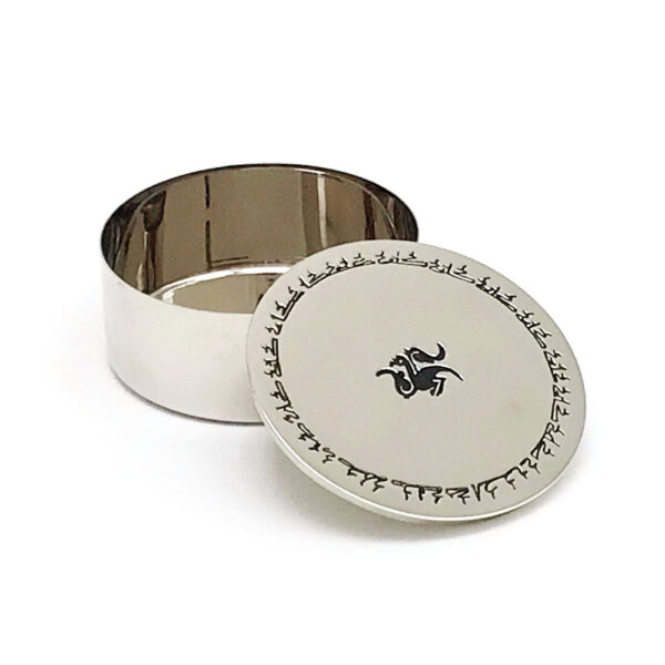 تم تصميم الصندوق المعدني المزخرف بفن الخط على شكل طائر حصريا لدار الآثار الإسلامية، وهو مصنوع يدويًا من نحاس مطلي بالنيكل محفور من الهند. التصميم مستوحى من القطعة: LNS 858 C وهي عبارة عن وعاء خزفي من القرن العاشر في إيران. النقش عبارة عن تكرار للحروف، ربما على نحو قريب من الدعاء بالبركة. يتكون الطائر الموجود في الوسط من نمط الخط مع تجريد الأجنحة على شكل أنصاف مراوح نخيلية.