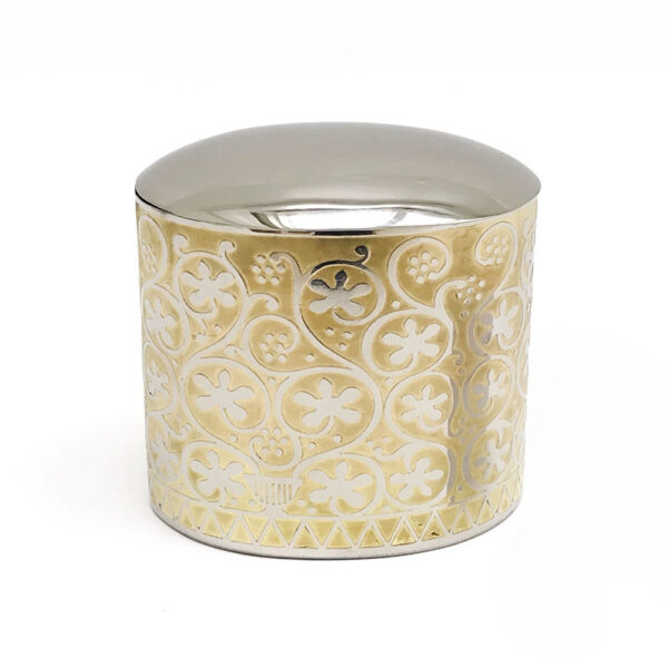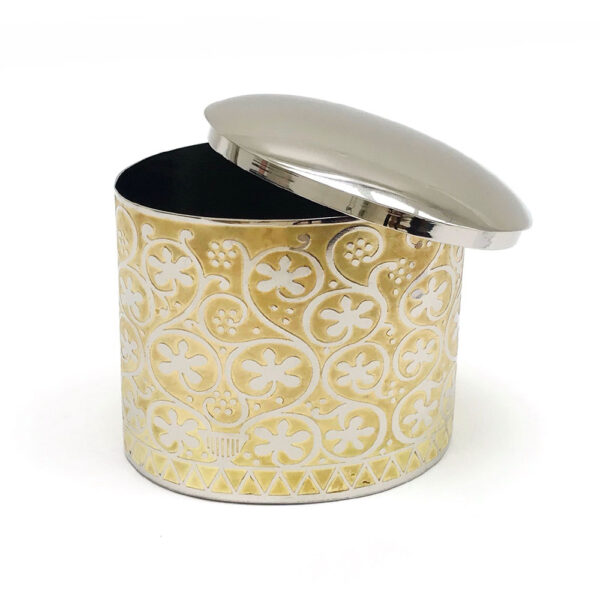 تم تصميم الصندوق البيضاوي الخاص بنا برسمة كرمة العنب (ذهبي)، حيث صنع حصريا (ويدويا) في الهند من النحاس المطلي بالنيكل، والذي تم حفره وطلاؤه بالمينا. التصميم مستوحى من القطعة: LNS 18 I وهي صندوق عاجي (مفقود الغطاء)، ومنقوش عليه كروم متعرجة تنطلق من خمسة مزهريات موزعة على مسافات متساوية حول قاعدة القطعة. القرن الثامن في سوريا، تم تنفيذه باستخدام مخرطة، ونحت من قطعة واحدة من ناب الفيل.