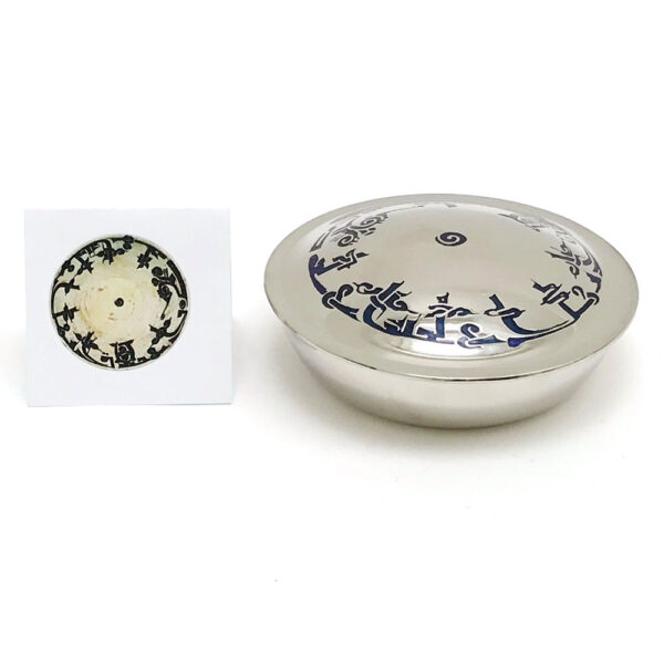 صندوق الجود الخاص بنا مصنوع يدويًا من النحاس المطلي بالنيكل، حصريًا لدار الآثار الإسلامية في الهند. وهي مزخرفة بعناصر محفورة بالمينا عليها نقش باللغة العربية: “الجود من أخلاق أهل الجنة والسلامة بركة”. التصميم مستوحى من القطعة: LNS 1093 C وهي عبارة عن وعاء من الخزف مع نقش دقيق للغاية بالخط الكوفي من القرن العاشر أو أوائل القرن الحادي عشر، شرق العالم الإيراني.