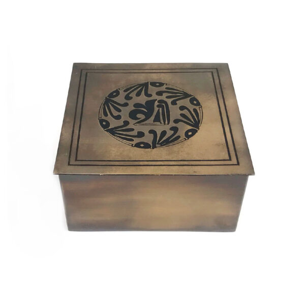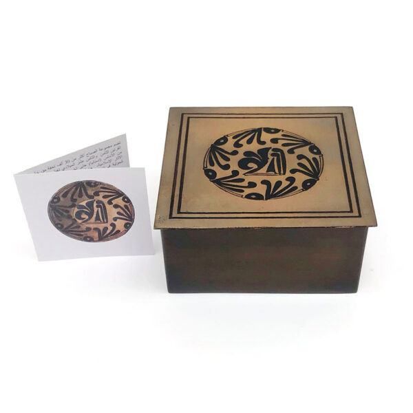 صُنع صندوقنا النحاسي المطلي بالنيكل بخط اليد حصريًا لدار الآثار الإسلامية في الهند. التصميم محفور ومطلي بالمينا. التصميم مستوحى من القطعة: LNS 331 C وهي عبارة عن وعاء خزفي من إيران (ربما نيسابور)؛ القرن العاشر الميلادي. إنه تصميم مميز حيث يبدو أن الكلمات هي في الواقع عناصر وحروف فردية وأدوات زخرفية متطابقة في تسلسل متكرر