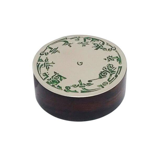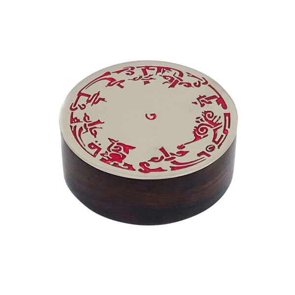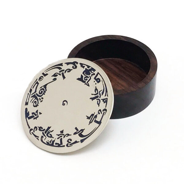 صندوق “الجود” الخاص بنا مصنوع يدويًا من قاعدة خشبية مع سطح نحاسي مطلي بالنيكل. صنع حصريًا لدار الآثار الإسلامية في الهند، وهو مزين بعناصر محفورة مطلية بالمينا بالنقش العربي: الجود من أخلاق أهل الجنة والسلامة بركة. التصميم مستوحى من القطعة: