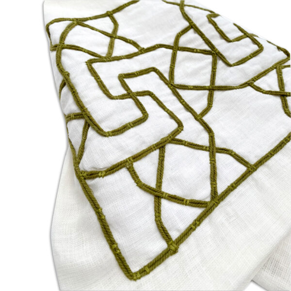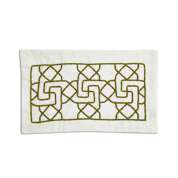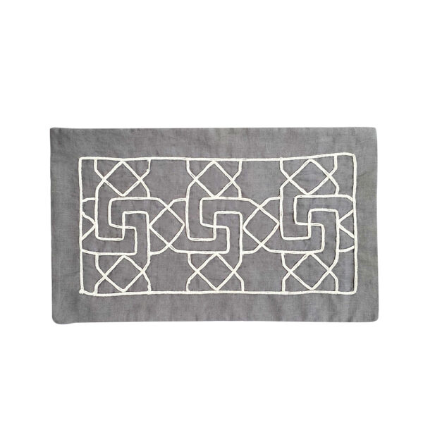 غطاء وسادة كتان صنع في الهند حصريًا لدار الآثار الإسلامية. التصميم مطرز بطريقة “Dori work” أحد أشكال التطريز الهندي. التصميم مستوحى من LNS 282 S و هو عبارة عن حاجز جالي رخامي منحوت في مستويين حيث تتكون الخلفية من صفوف من المعينات وفي المقدمة تظهر نجمة ثمانية الرؤوس وصليب معقوف. الهند، ربما القرن الرابع عشر الهجري / العشرين الميلادي.
