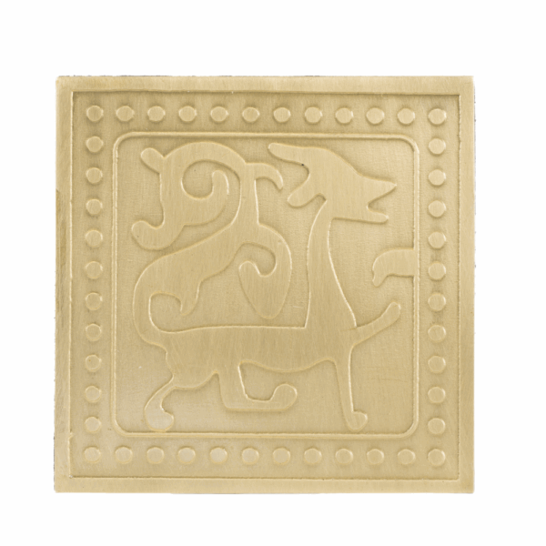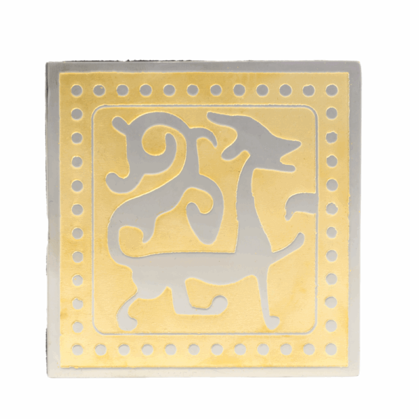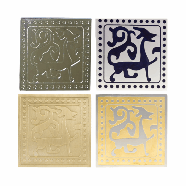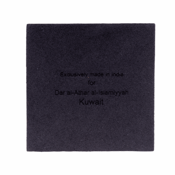 صُنعت قاعدة الأكواب النحاسية المطلية بالنيكل في الهند لصالح دار الآثار الإسلامية حصريا. وهذه القطعة مستوحاة من قطع بلاط سداسية تضم ثلاثة وعشرين مربعا صغيرا وبقايا بلاط آخر(LNS 1077 C). ويبدو الفخار بلون وردي باهت مغطى ببطانة طينية بلون موحد بأسفله طلاء شفاف غير ملون، تعود هذه القطعة للقرن السادس الهجري / الثاني عشر الميلادي من منطقة إيران الشرقية