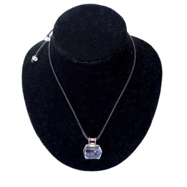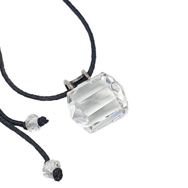 صُنعت هذه الدلاية من الكريستال الصخري المقطوع يدويًا في الهند باستخدام تقنيات عريقة، وقد تم استلهام قطعها من ألماسة من القرن السابع عشر. صنعت حصريًا لدار الآثار الإسلامية. تتدلى من سلك حرير بنهايات صغيرة من الخرز الكريستالي. هذا التصميم مستوحى من LNS 1804 J (تميمة) مقطوعة من ماسة 28.3 قيراط مائلة إلى اللون الأصفر من الهند أو الديكن أو الهند المغولية، ربما القرن السابع عشر الميلادي أو قبل ذلك.