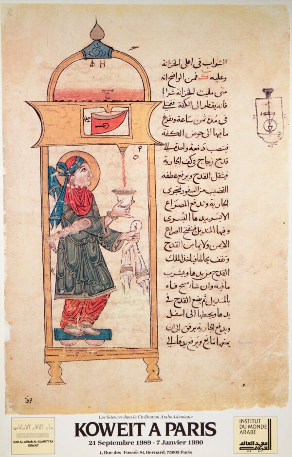 معرض “العلوم في الحضارة العربية الإسلامية” في معهد العالم العربي، باريس 1989. لوحة من مخطوطة لفتاة صغيرة تقدك للملك من كتاب “الجامع بين العلم والعمل النافع في صناعة الحيل” إسماعيل بن الرزاز الجزري، على الأرجح بغداد، بتاريخ رمضان 715 هـ / كانون الأول 1315 م. LNS 17 MS f88V