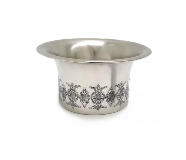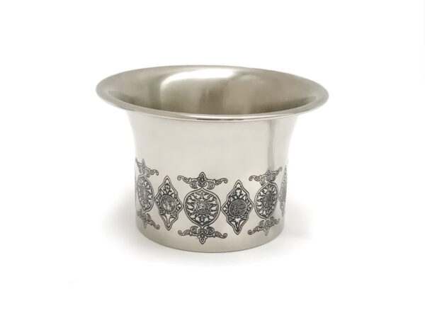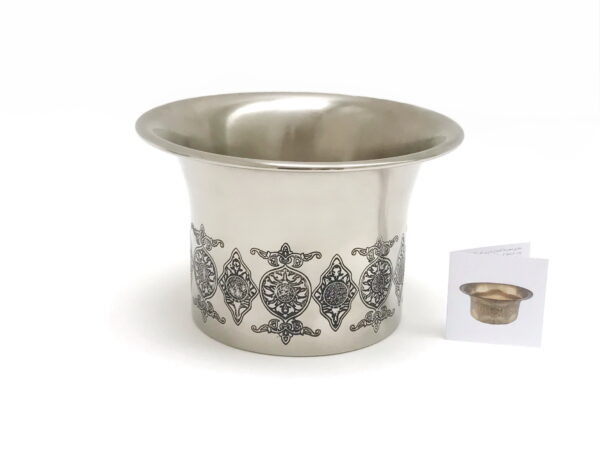 هذا الوعاء مصنوع يدويا من النحاس المصقول، حصريًا لدار الآثار الإسلامية في الهند. التصميم المحفور مستوحى من قطعة من القرن الثامن في المجموعة، وهي القطعة: LNS 110 M عبارة عن حوض نحاسي من مصر أو سوريا، القرن الثامن الهجري / الرابع عشر الميلادي. وهو مطعم بالفضة وعليه كتابات بخط الثلث تمدح ضابط الملك الناصر محمد بن قلاوون. يشتمل التصميم على أقواس مدببة ورصائع وأشكال حيوانية ونباتية متنوعة.