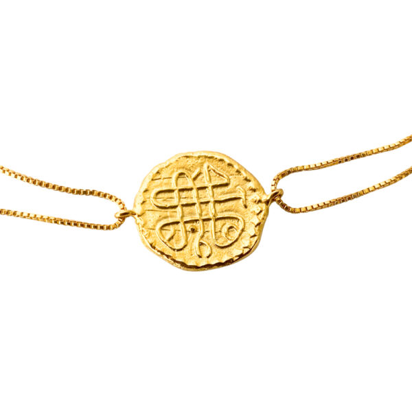 This exclusively made sterling silver, gold-plated bracelet is inspired by the Kuwaiti ‘Baisa’ coin. It is the first coinage of The State of Kuwait in 1304 Hijri/ 1886 AD during the rule of Sheikh Abdallah al-Sabah and the first coins to be issued by an Arab country claiming independence from the Ottoman Empire.