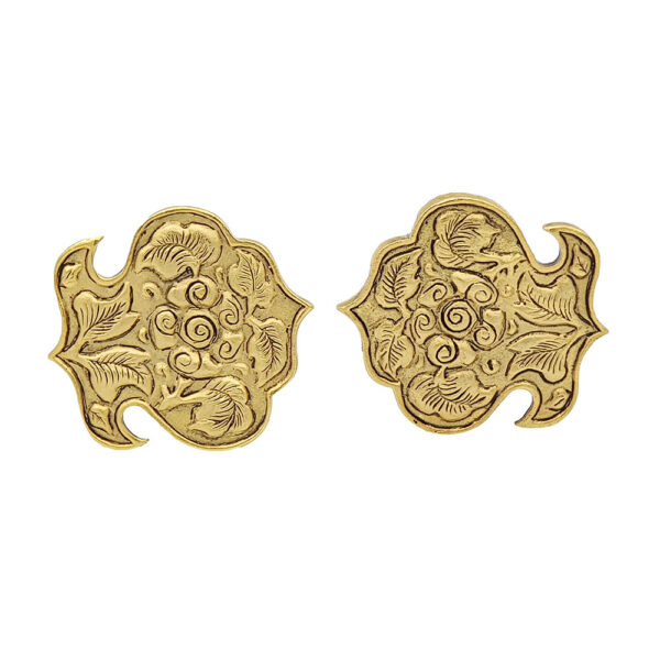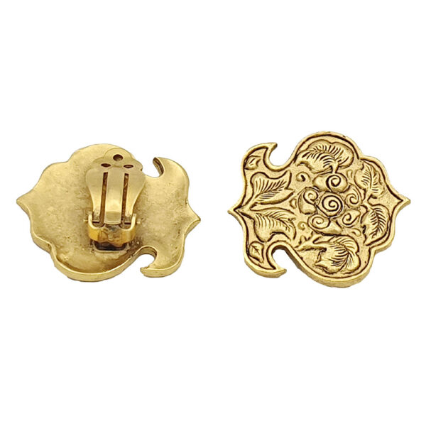 These lovely Cavetto earrings were inspired by the floral & leaf design of a 17th century Iranian ceramic dish. Exclusively made for DAI, they have a clop backing and are made of 24K gold plate over pewter. Inspirational object: LNS 101 C is a large frit body with underglaze painting in blue and black is representative of the fine wares produced in Kerman and Mashhad, Iran in the 17th Century.