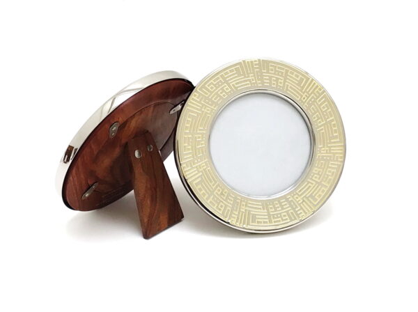 إطار “دولة الكويت” الدائري لسطح الطاولة، مصنوع من النحاس المحفور المطلي بالنيكل، مع دعامة من الخشب. صُنع حصريًا لدار الآثار الإسلامية في الهند، وقد نقش عليه “دولة الكويت، حافظها الله”. صمم هذا النقش الكوفي المربع مانويل كين، وهو أمين سابق لمجموعة الصباح وخبير في الخط الكوفي، أثناء احتلال الكويت 1990-1991. الخط الكوفي هو نظام يتضمن تكوين تصميمات صارمة على شبكة مربعة تكون فيها أشكال الحروف و “الخلفية” من نفس الأبعاد، ويكون تأثير التصميم متساوٍ.