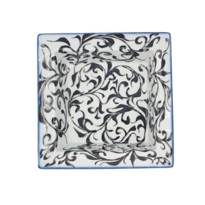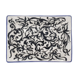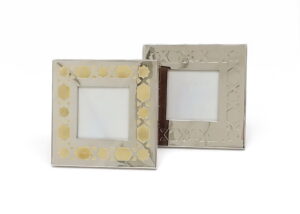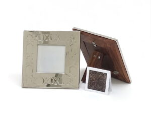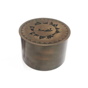 This hand-tooled tabletop frame of nickel-plated brass was made in India exclusively for DAI. The top is etched and enamel painted with the Arabic inspription: al’Allahi fi kul il omuri tawakuli – Rely on God in all matters. Inspirational object: LNS 137 M is a decorative steel roundel inlaid with gold, the central circle with an elaborate calligraphic device. From the Iranian world, 17th – 18th century, the Jawhar (watered) steel is pierced, engraved and inlaid.