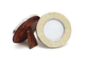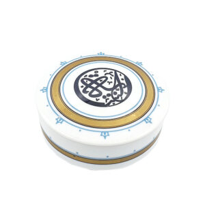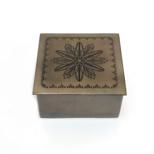 Our exclusive Dawlat al Kuwait metal box is made of etched nickel-plated brass. Made exclusively for DAI in India it is inscribed with Dawlat al-Kuwait, Hafizuha Allah – God is the Protector of the State of Kuwait. This square Kufic inscription was designed by Manuel Keene, former curator of The al-Sabah Collection & expert in Kufic calligraphy, during the 1990-91 occupation of Kuwait. Kufic calligraphy is a discipline involving the composition of rigorous designs on a square grid in which letter forms & ‘background’ are of the same dimensions and of equal design impact.