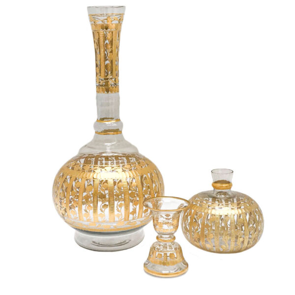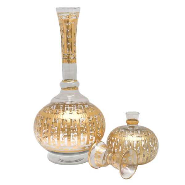 “هذا الزجاج المذهل ذو العنق الطويل المنفوخ بشكل يجمع بين كرة وأسطوانة، كان يصنع تقليديا من الطين للاحتفاظ بالماء في الهند. صنعت هذه النسخة الزجاجية في الهند ، وقد تم العمل عليها على القضيب الحديدي، وحفرت، وزينت بأوراق الذهب. التصميم مستلهم من القطعة: