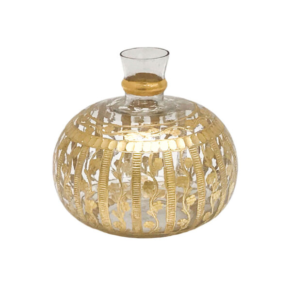 “هذه الزجاجة المستديرة المزخرفة الجميلة، المثالية كمزهرية رائعة، تم نفخها في الهند، وقد تمت صناعتها على القضيب الحديدي، وهي محفورة ومذهبة. التصميم مستلهم من القطعة:
