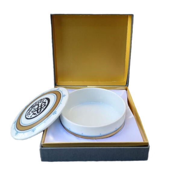 تم استلهام التصميم من علبة خزفية فاخرة من رصيعة وجدت في لفيفة من القرن الثامن / الرابع عشر. الكلمة باللغة العربية تترجم إلى “الشافي”. تم تصميمه وصنعه حصريًا من قبل كيهارا / اليابان لدار الآثار الإسلامية ، ويمكن وضعه بعناية في غسالة الأطباق وهو آمن للطعام. التصميم مستلهم من القطعة: