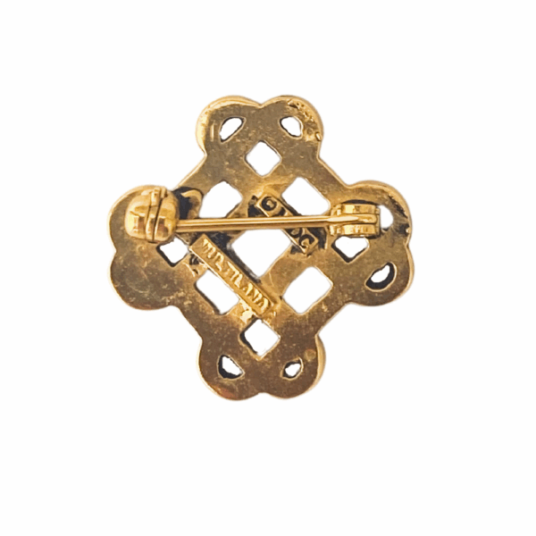 This interlacing brooch is Inspired by the centre motif of a gold filigree rosette. Made exclusively for DAI, it is 24K antique gold plated over pewter.