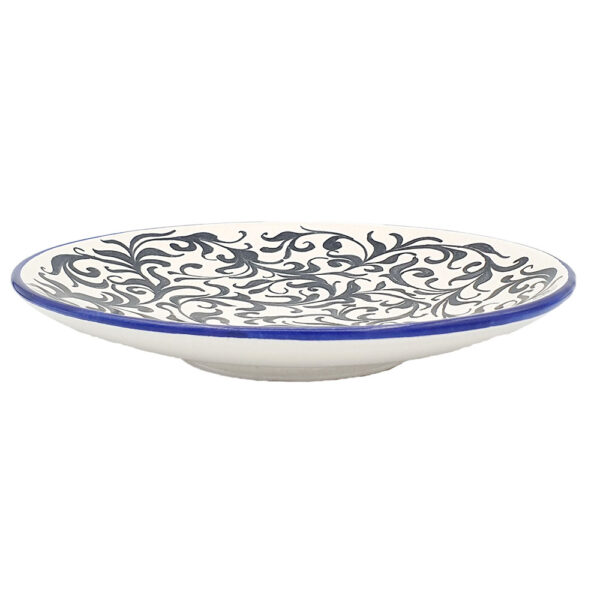 “طبق من الخزف الأسود والأبيض بحواف زرقاء رفيعة وتصميم نباتي من القصب المائي من القرن التاسع. صُنع هذا الطبق حصريًا لدار الآثار الإسلامية وفقًا لتقاليد صناعة الخزف الإيطالي العريق. للعناية بالقطعة، من الأفضل تجنب الاختلافات السريعة والمتطرفة في درجات الحرارة ؛ آمن للطعام وغسالة الصحون. التصميم مستلهم من القطعة: